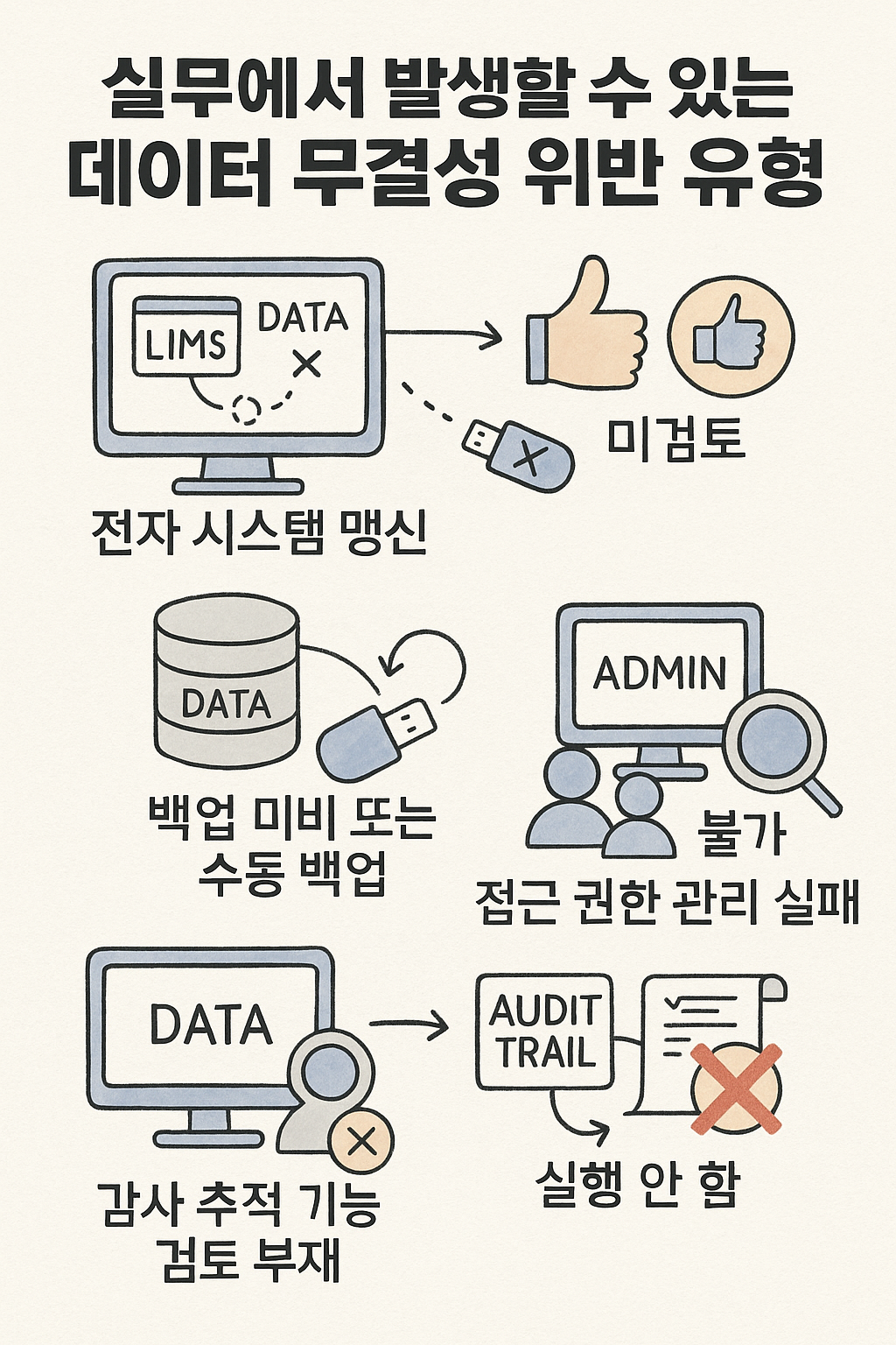 - 실례: LIMS 자동 저장만으로 승인 처리, Audit Trail 미검토